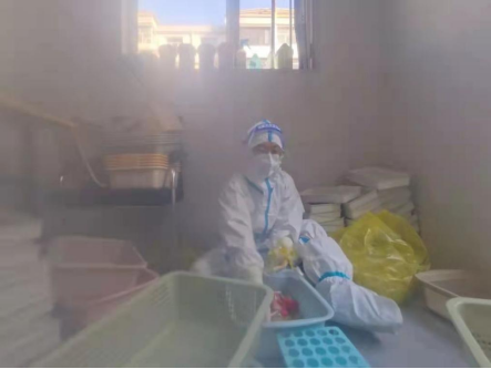 防護服、隔離衣、N95口罩、護目鏡、雙層手套、鞋套......全副武裝后,既不能喝水,也不能上廁所,在實驗室里一待就是七八個小時。在這次檢驗中,李寶華所在的二區(qū)樣品制備間每班四個人,流水線作業(yè),醫(yī)院檢驗科的工作人員負責將標本加入到提取試劑孔中,李寶華負責將樣本放在核酸提取儀里提取,然后將提取好的核酸交給下一位工作人員加入到八連排試管架中,然后四個人輪換的把八連管的蓋扣緊。在這個特別費手指頭的環(huán)節(jié),每個人都要連扣幾板,按著按著手指痛的就按不動了。看似簡單的工作,卻要求全神貫注,一絲不茍,認真的拆分、上架,同時要做好個人手衛(wèi)生,無數(shù)次重復的實驗,需要嚴謹細心的態(tài)度,確保實驗結果準確無誤。一天工作下來,滿身是汗,耳朵也被口罩壓出紅印子,面部也有深深的壓痕。雖然核酸檢測工作很艱辛,李寶華卻無悔加入到這支平凡而不普通的隊伍。防疫戰(zhàn)線上,無論是下沉小區(qū)值守的“守衛(wèi)者”,還是核酸檢測的“掃雷員”,都都抗議路上逆行孤勇者,他們用點點微光,匯聚起戰(zhàn)勝疫情的強大力量。我們向他(她)們致敬,感謝他們的每一份付出。