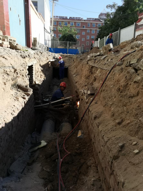 到目前,庭院管網部分,已開挖管溝70米,剩余主管網和樓棟支線預計16天全部鋪設焊接完成;單元立管部分全部焊接完成,戶內分戶改造完成55戶。