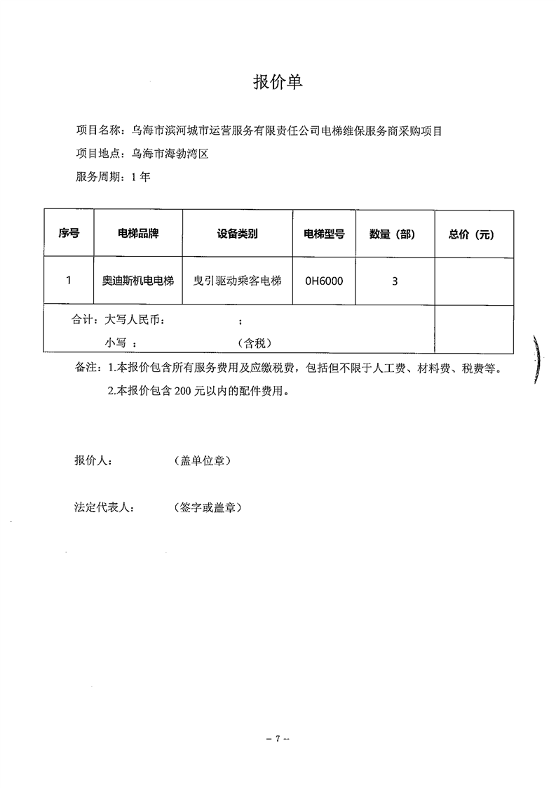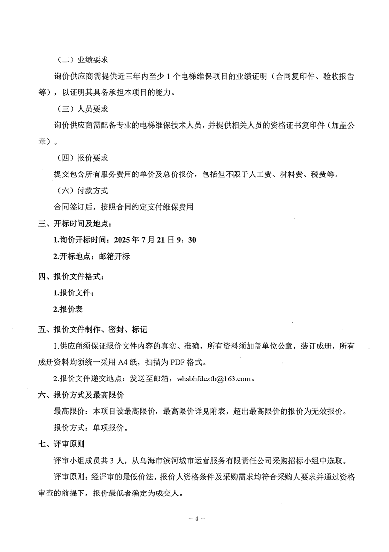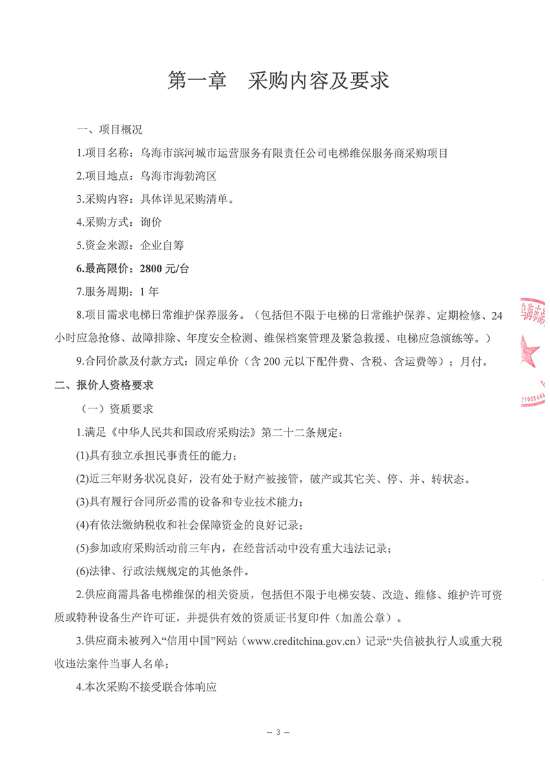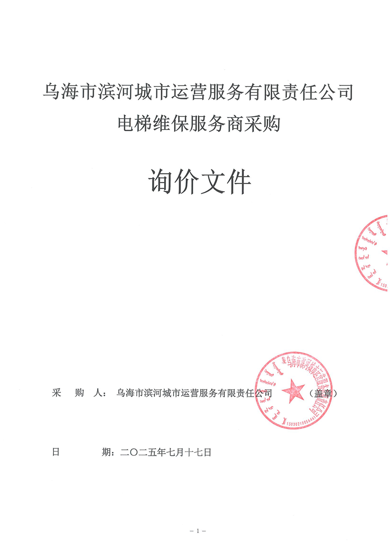 烏海市濱河城市運(yùn)營服務(wù)有限責(zé)任公司電梯維保服務(wù)商采購詢價文件