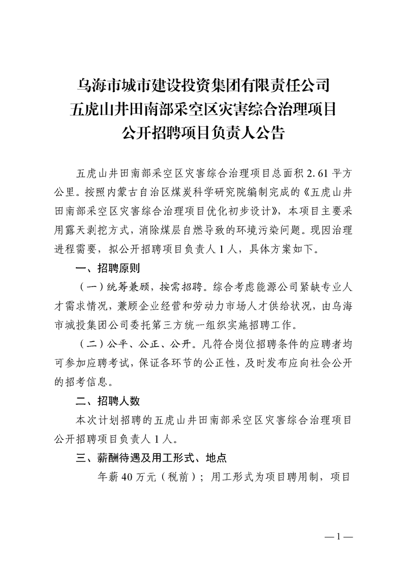 烏海市城市建設(shè)投資集團(tuán)有限責(zé)任公司五虎山井田南部采空區(qū)災(zāi)害綜合治理項(xiàng)目公開(kāi)招聘項(xiàng)目負(fù)責(zé)人公告