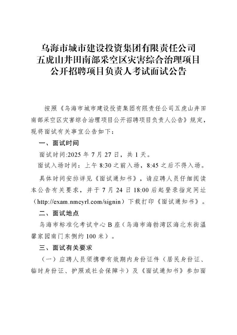 烏海市城市建設(shè)投資集團(tuán)有限責(zé)任公司五虎山井田南部采空區(qū)災(zāi)害綜合治理項目公開招聘項目負(fù)責(zé)人考試面試公告