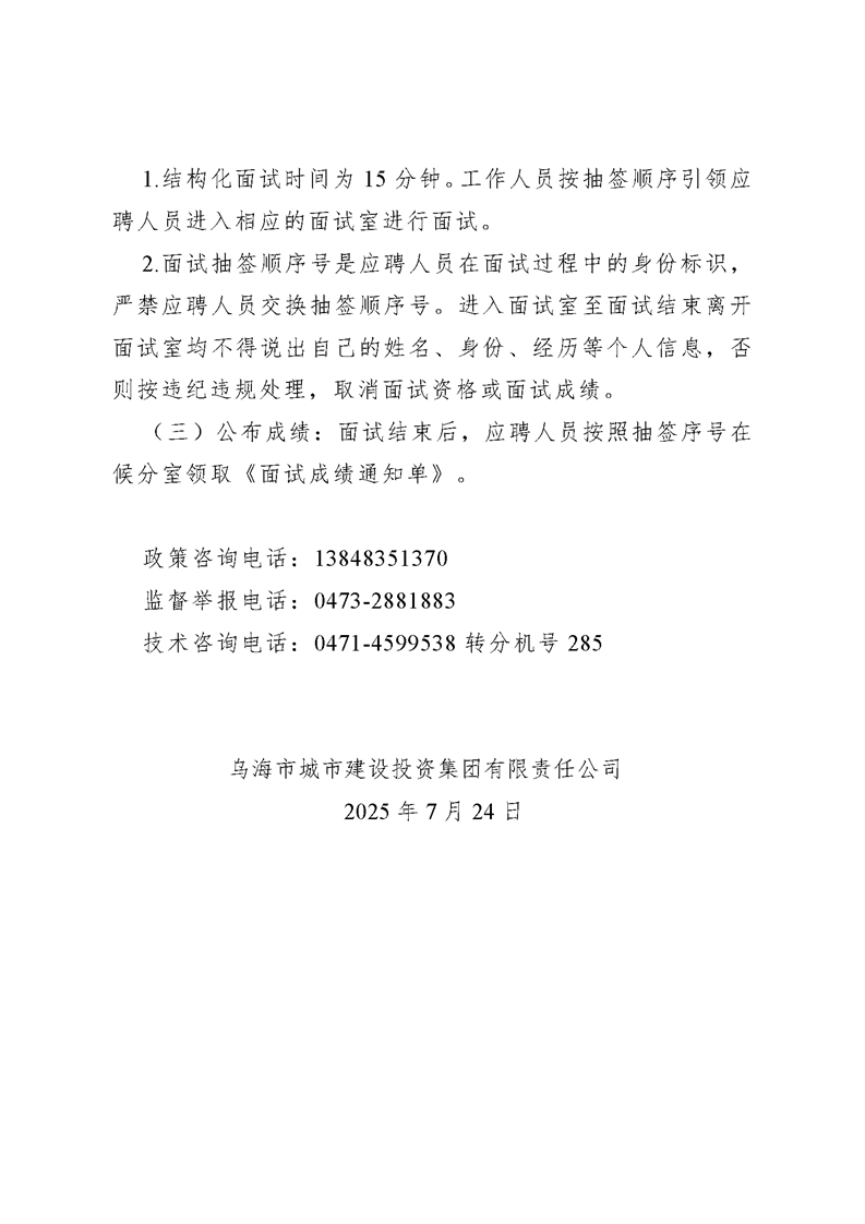 - 2025-07-27烏海市城市建設(shè)投資集團(tuán)有限責(zé)任公司五虎山井田南部采空區(qū)災(zāi)害綜合治理項目公開招聘項目負(fù)責(zé)人考試面試成績查詢的通知