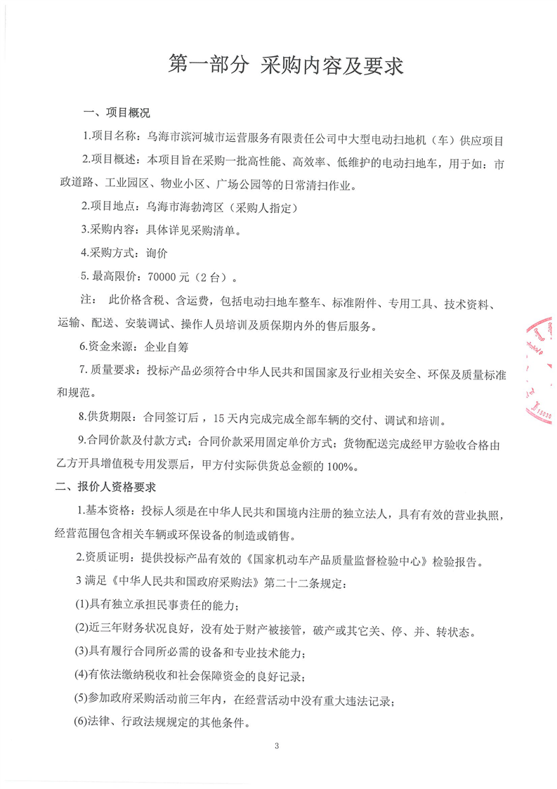 烏海市濱河城市運(yùn)營服務(wù)有限責(zé)任公司中大型電動掃地機(jī)(車)供應(yīng)項(xiàng)目詢價(jià)文件